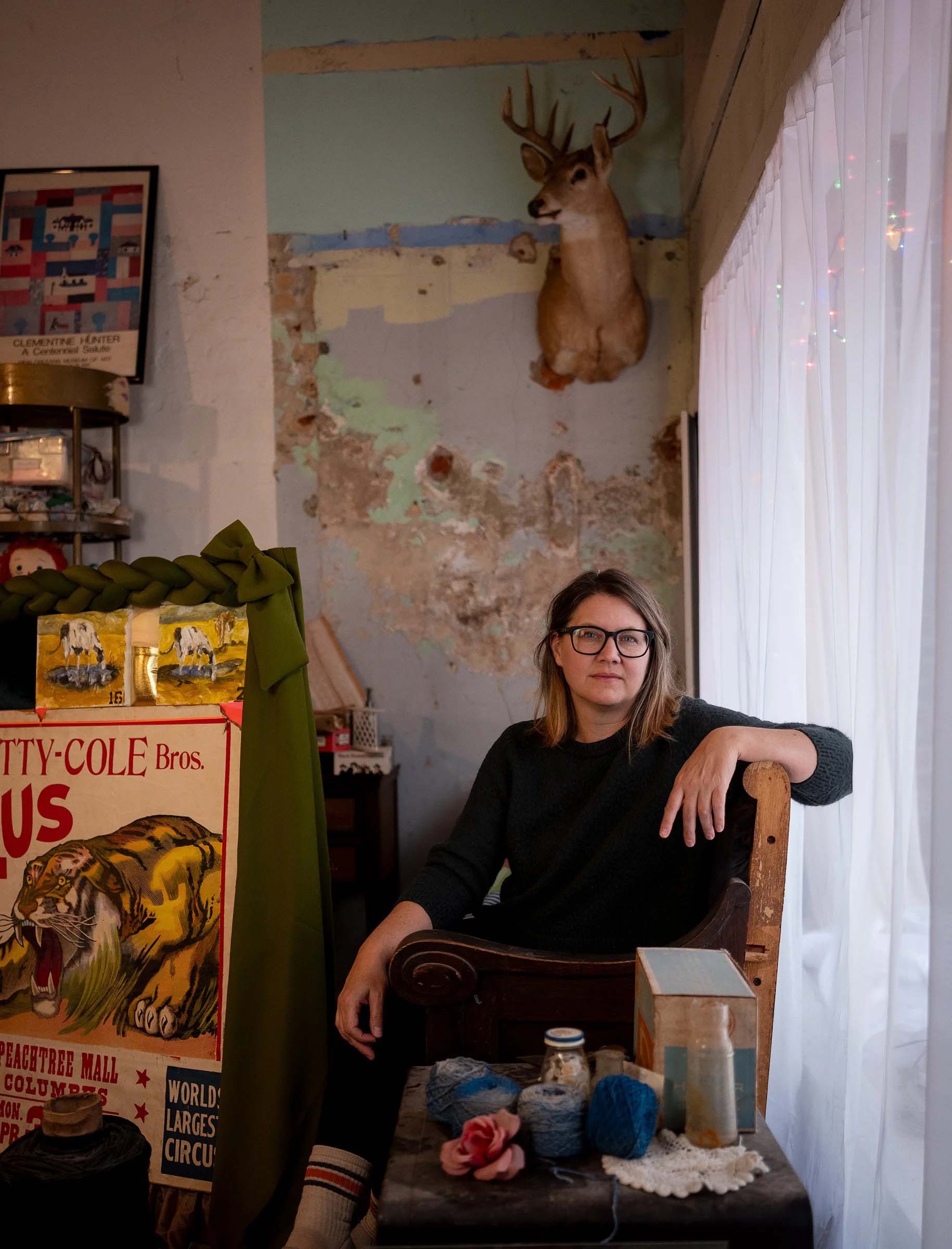 Working from her studio in Water Valley, Mississippi, Fussell has developed a distinctive practice that merges quilting, painting, sculpture, and photography into layered textile works that challenge traditional boundaries between craft and fine art. Drawing from donated and discarded materials, her work carries the embedded histories of everyday life, transforming familiar fabrics into complex visual narratives that explore memory, landscape, and the emotional terrain of the rural South.